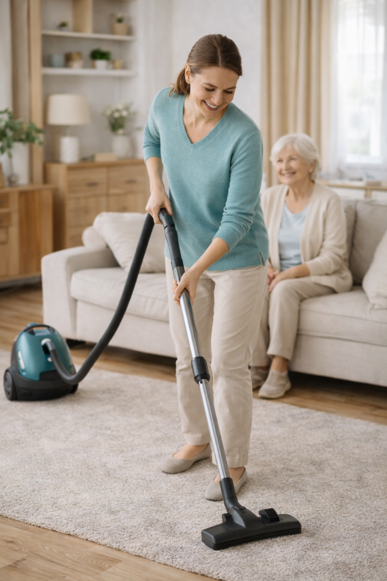 Eine Betreuungskraft lebt im Haushalt und unterstützt bei alltäglichen Aufgaben, der Haushaltsführung sowie der sozialen Begleitung.